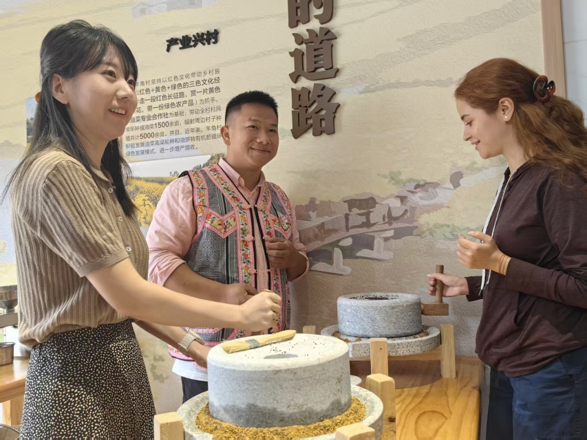 ▲外籍教师(左一、右一)在当地苗族非遗代表性传承人(中)的指导下推石磨磨菜籽油。记者 罗芸 摄