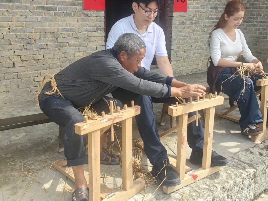 ▲外籍教师(右一、右二)在当地村民指导下,体验编草鞋。记者 罗芸 摄